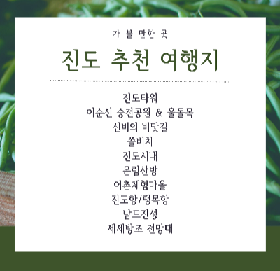 이 외에 진도 아리랑, 진돗개, 이순신 관련한 관광지가 더 있더라고요.