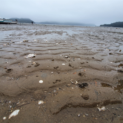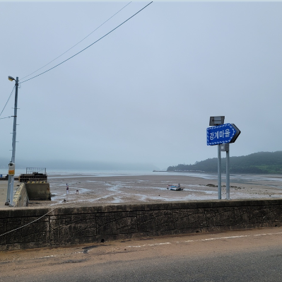 체험은 못하고 아쉬운 마음에 드라이브하다가 갯벌이 보여서 들어갔어요. 뭐 잡지는 않고 위로 걸어봤어요. 전 날 물이 꽉 차있는 모습을 보다가 쑥 빠진 모습을 보니 정말 신기했어요. 사진 속 모습은 강계마을이라고 파도모양 표지판이 있는 곳입니다.