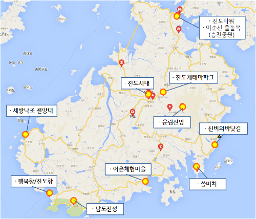 보통 행정구역 홈페이지에 가면 관광지도가 있는데, 진도는 구글맵으로 볼 수 있더라고요.